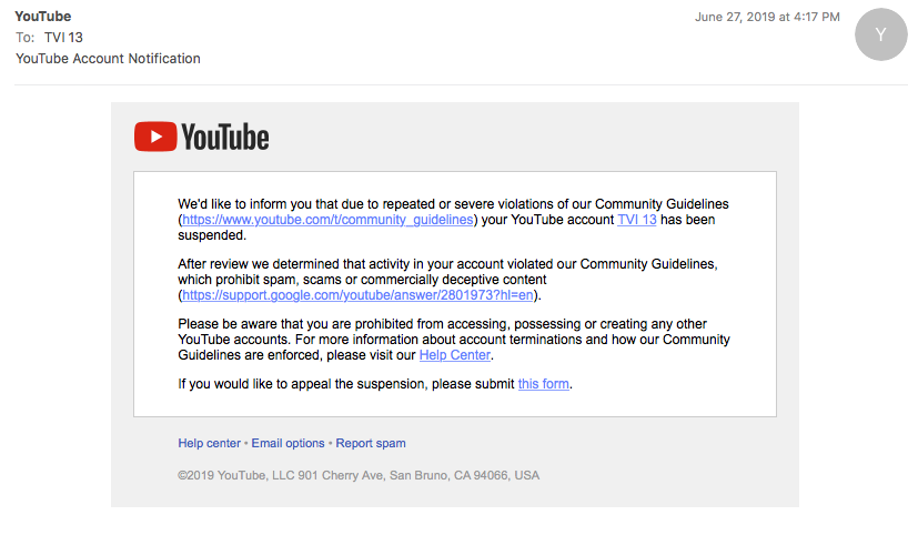 YouTube had previously shut down our TVI13 and PopFindDaily accounts without reason or warning.