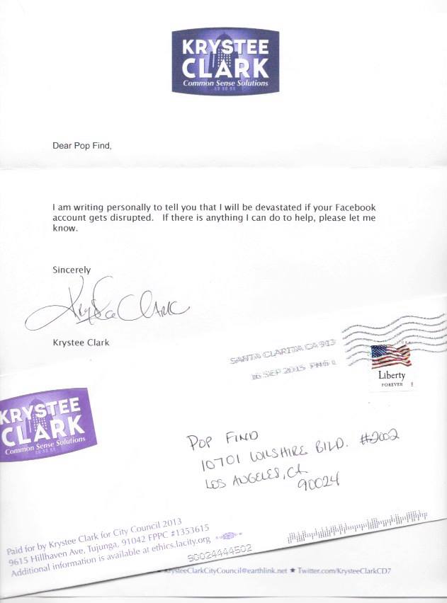I've got mail! More proof of my authentic name! A letter addressed to me, Pop Find 10701 Wilshire Blvd #2002 Los Angeles CA 90024 and sent to my address via the US Postal Service.